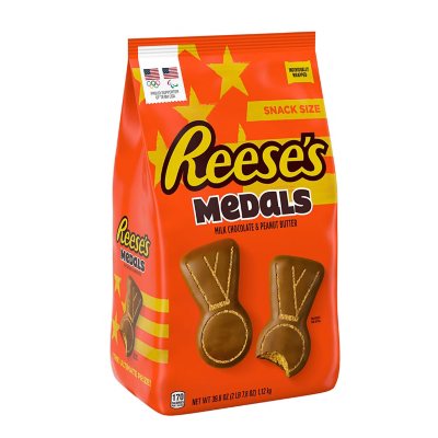 You can't beat this match made in heaven when it comes to milk chocolate combined with peanut butter, now in fun medal shapes to support Team USA at the Olympic & Paralympic Games. REESE'S milk chocolate peanut butter medals are ready to be your go-to snack. Bring this bulk bag of individually wrapped snack size candies along to the next sporting event as a concession treat or while watching Team USA at the Olympics with friends and family. Store them in your pantry for an anytime snack or slip a pack into lunch boxes and purses for a midday surprise.